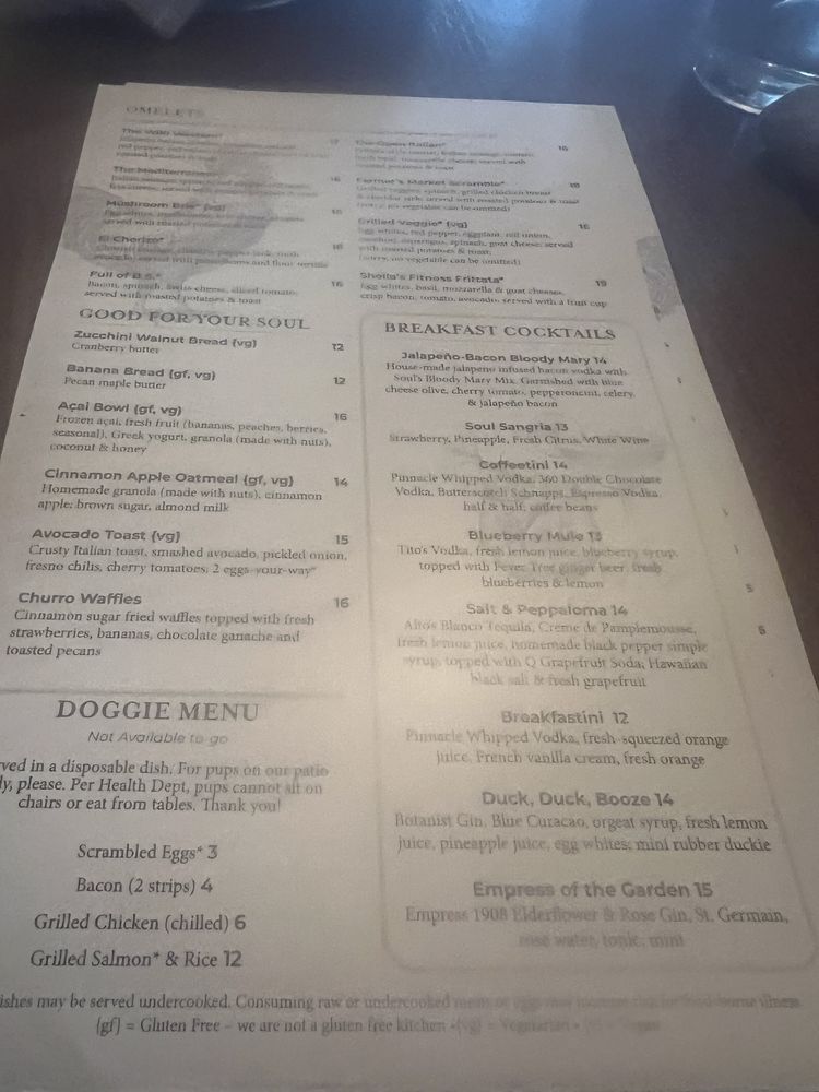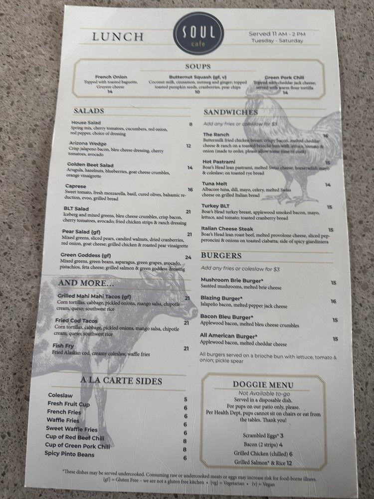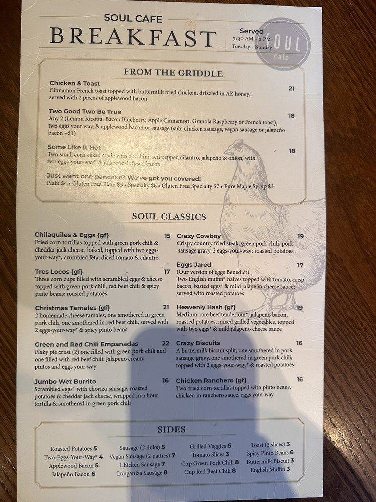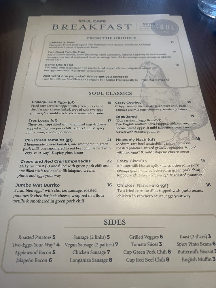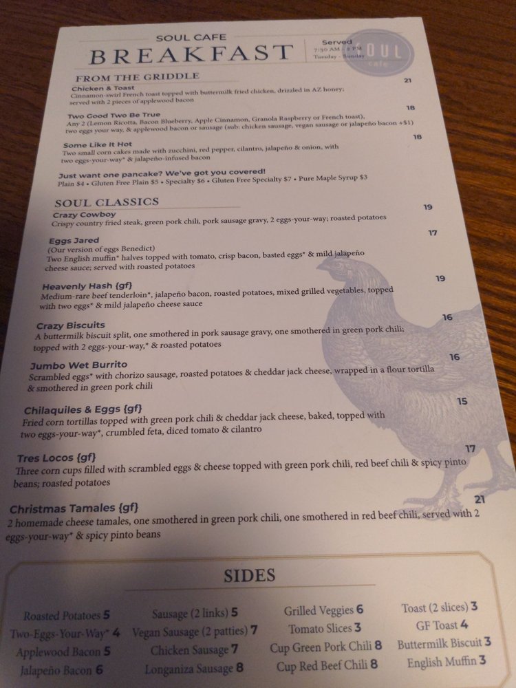 Introducing the menu at Soul Cafe, a New American restaurant in Scottsdale, AZ, known for its Breakfast & Brunch and Comfort Food options. This women-owned establishment offers a variety of amenities, including Vegan and limited Vegetarian options, wheelchair accessibility, and free Wi-Fi. Customers praise the generous portions and excellent service, making it a go-to spot for groups and families. Highlights include the Tres Locos and Green/Red Chili empanadas, Blackened Catfish, and Christmas tamales. The vibrant Latin vibes on the menu add a unique touch to the dining experience. With a full bar, happy hour specials, and a range of payment options including cryptocurrency, Soul Cafe caters to a diverse clientele. Whether you're looking for a casual meal or a special brunch outing, this spot is sure to impress with its flavorful dishes and welcoming atmosphere.